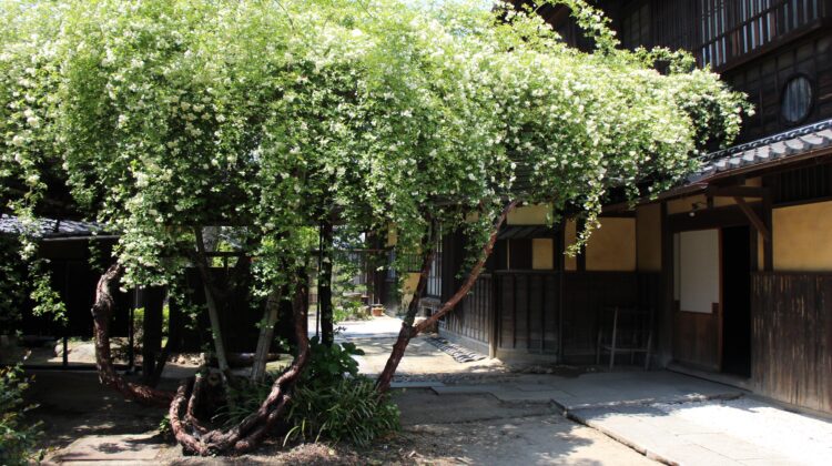小栗家住宅の庭には、「萬三の白モッコウバラ」と呼ばれる樹齢150年を超える日本最古・最大級の白モッコウバラが植えられてます。「萬三の白モッコウバラ」は2011年に、半田市の天然記念物に指定され、可憐な白い花を咲かせる4月中旬から5月初旬には一般公開が行われ、香り高く美しい花姿は訪れる大勢の人々を楽しませてくれます。