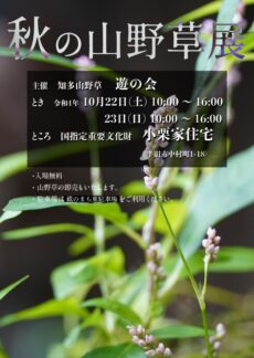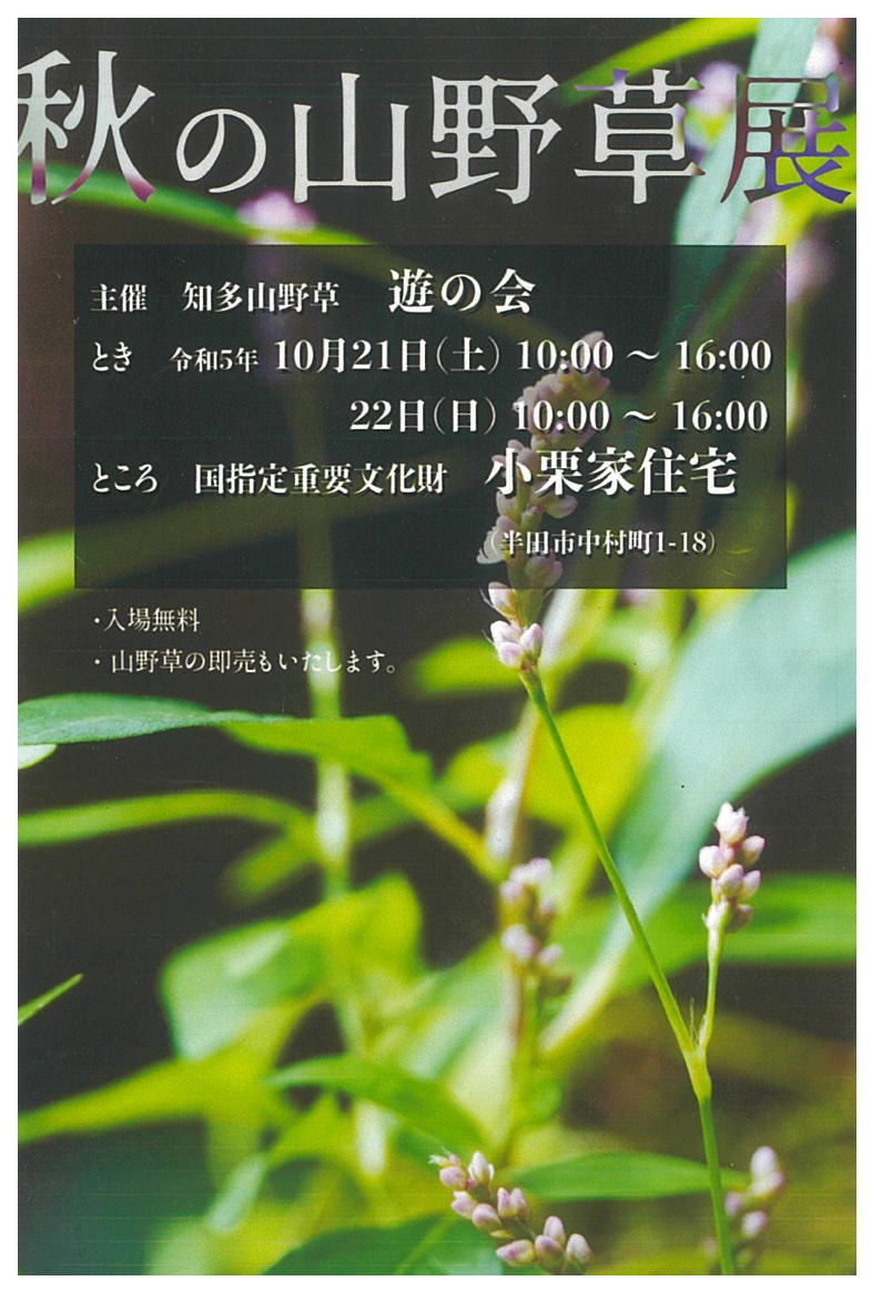 蔵のまちエリア 2023/10/20 up 秋の山野草展 山野草の作品を展示します 開催日程 2023/10/2110/22 開催場所 国指定重要文化財小栗家住宅 山野草の展示や販売を行います。 ◇開催日:2023年10月21日・22日 ◇時 間:10:00~16:00 予約不要 ◇場 所:国指定重要文化財小栗家住宅(半田市中村町1−18) ※駐車場は蔵のまち東駐車場をご利用ください。 ◇料 金:無料 ◇主 催:知多山野草 遊の会