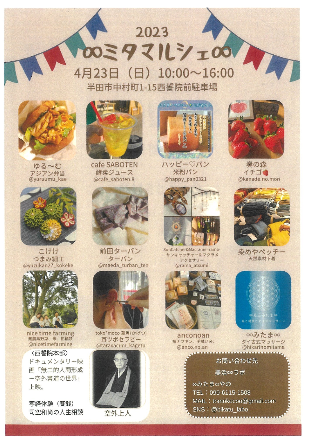 『萬三の白モッコウバラ祭』期間中、会場となる小栗家住宅内の西誓院で、美容と健康をテーマにしたマルシェを開催致します。カラダに優しくおいしいごはんやおやつ、癒し体験を、ココロ落ち着く歴史ある静かな場所でお楽しみ下さい。西誓院ゆかりの山本空外上人に関する展示やドキュメンタリー映画の上映もございます。