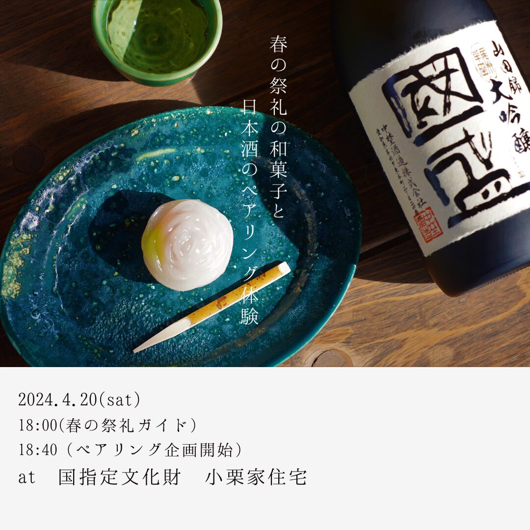 春の祭礼のガイドと、目の前でつくる限定上生菓子の実演と、日本酒のペアリングをお楽しみいただけます。