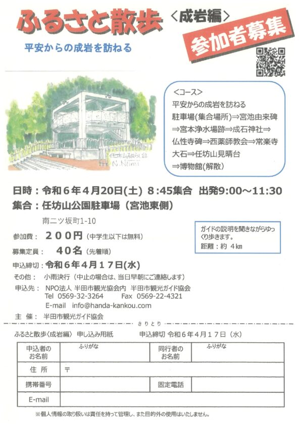 ①任坊山公園駐車場/集合⇒②宮池由来碑⇒③宮本浄水場跡⇒④成石神社⇒⑤仏生寺碑⇒➅西薬師教会⇒⑦常楽寺 大石⇒⑧任坊山見晴台⇒⑨半田市立博物館/解散(距離:4.0km)