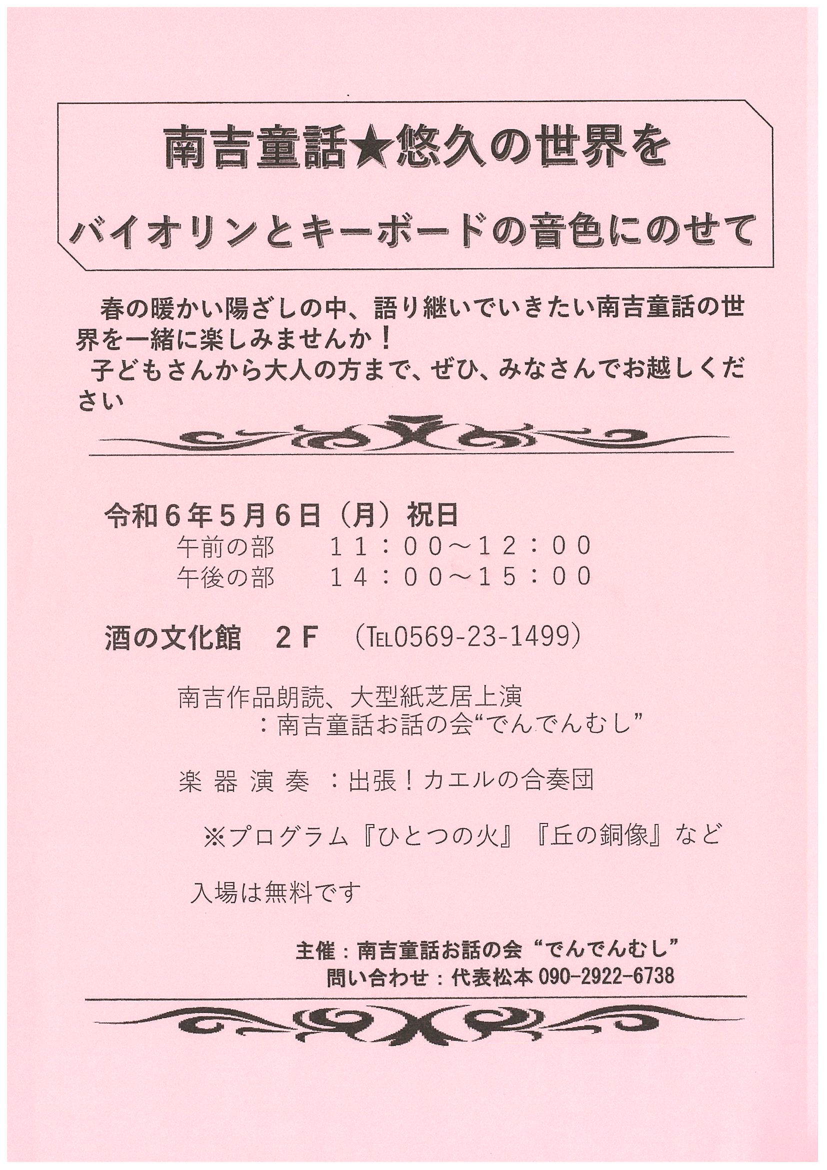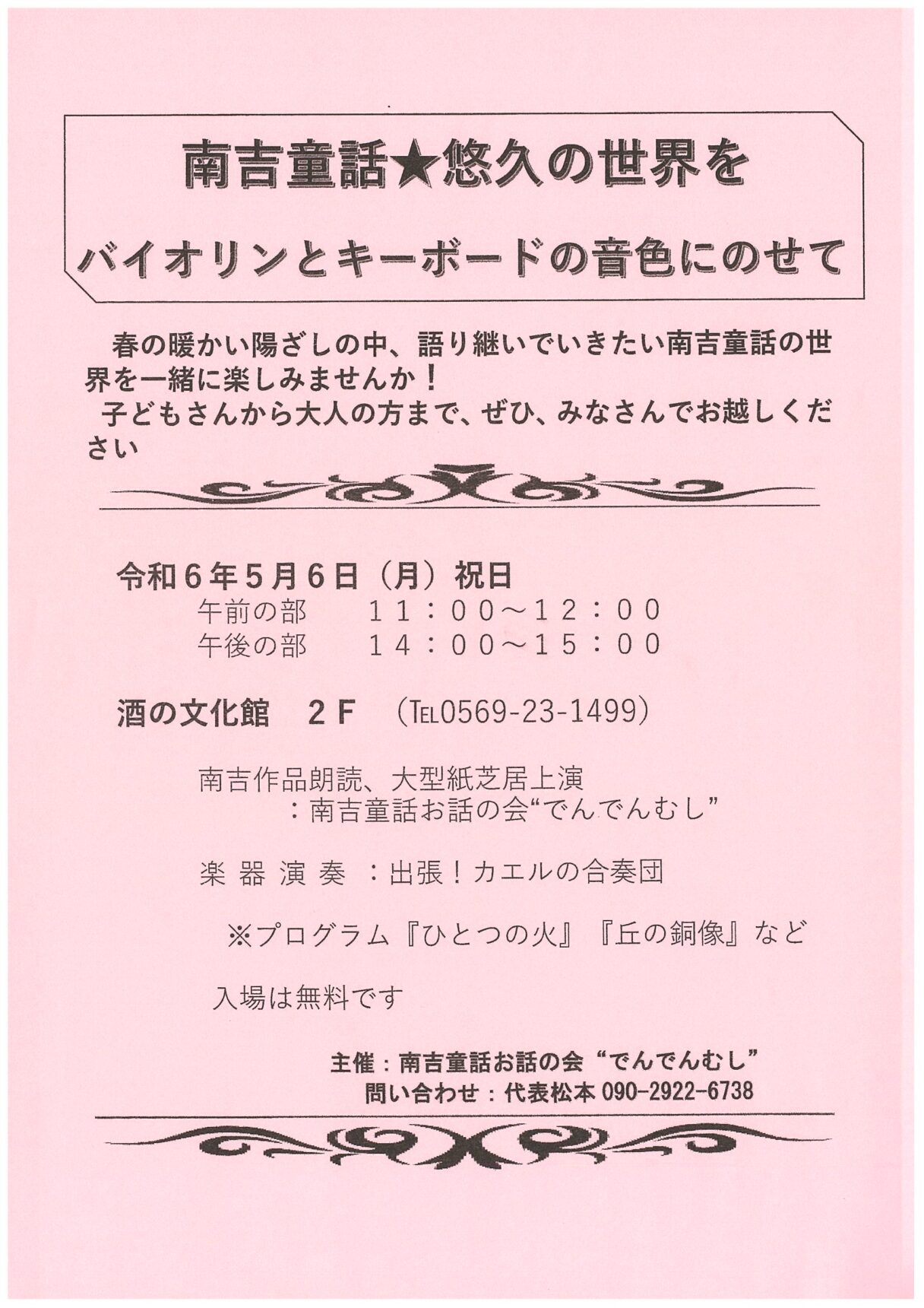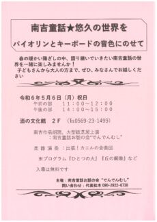 バイオリンとキーボードの優しい音色にのせた南吉童話の世界を楽しみませんか?ご家族やお友達と一緒に、お気軽にお立ち寄り下さい。