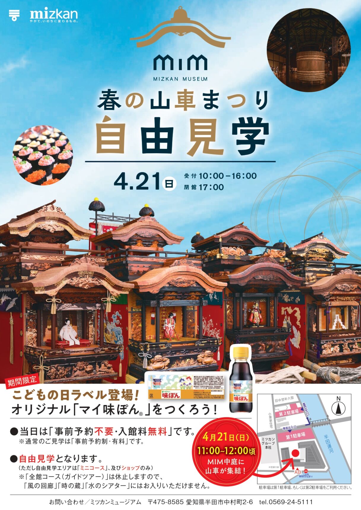 お待たせ致しました!リニューアルオープンしてから初のMIM自由見学開催です。事前予約不要&入館無料、ご自分のペースで館内(「大地の蔵」「光の庭」「ショップ」)をゆっくりと見学して頂けます。人気のオリジナル「マイ味ぽん®」にはこどもの日ラベルが登場!期間限定なので、ぜひ作って下さいね。