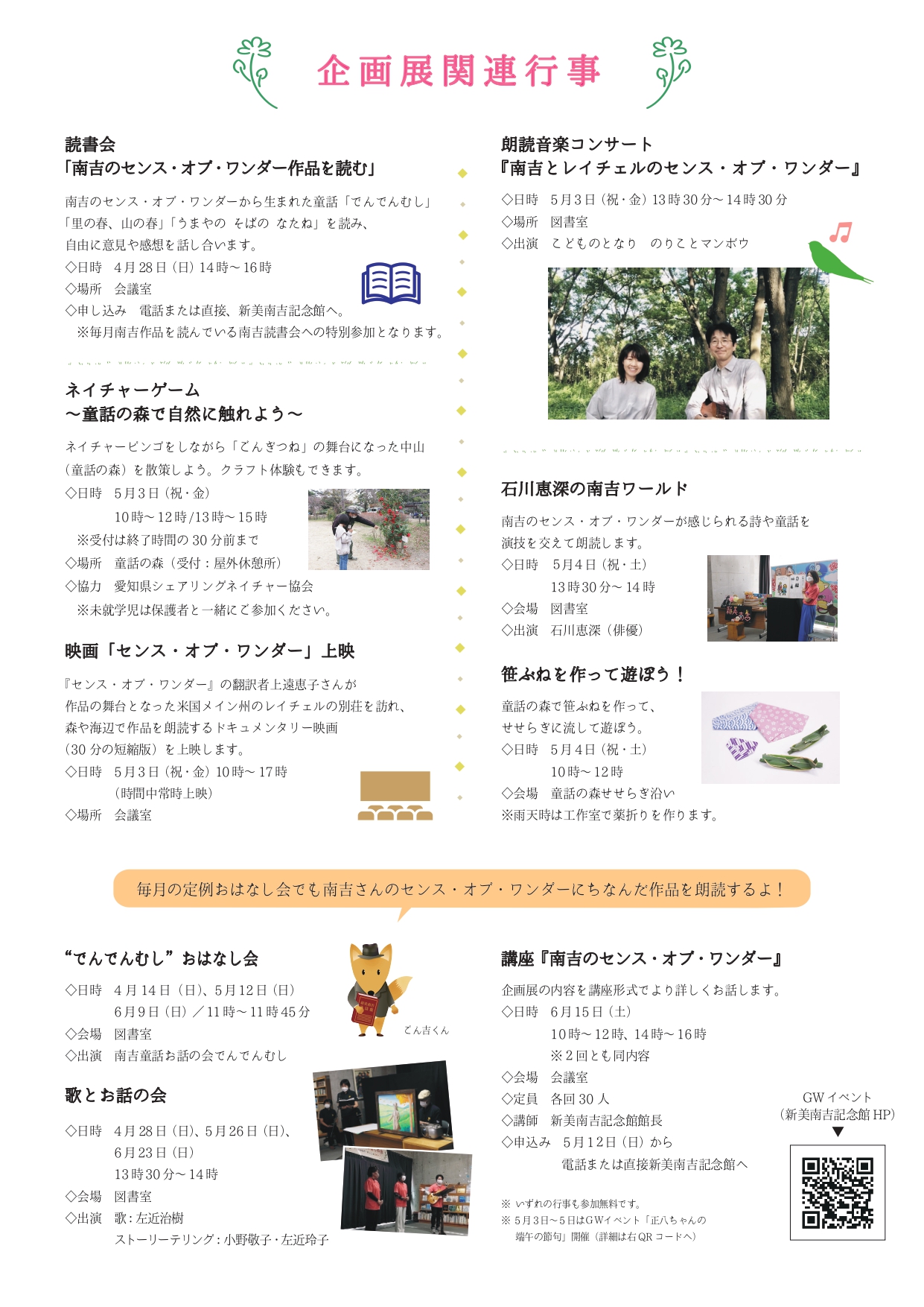 会期間中は、学芸員による解説「ミュージアムトーク」や文学講座『南吉のセンス・オブ・ワンダー』、映画『センス・オブ・ワンダー』上映会等、色々な関連行事が開催されます。行事開催日時・詳細はチラシまたは記念館HPよりご確認下さい。