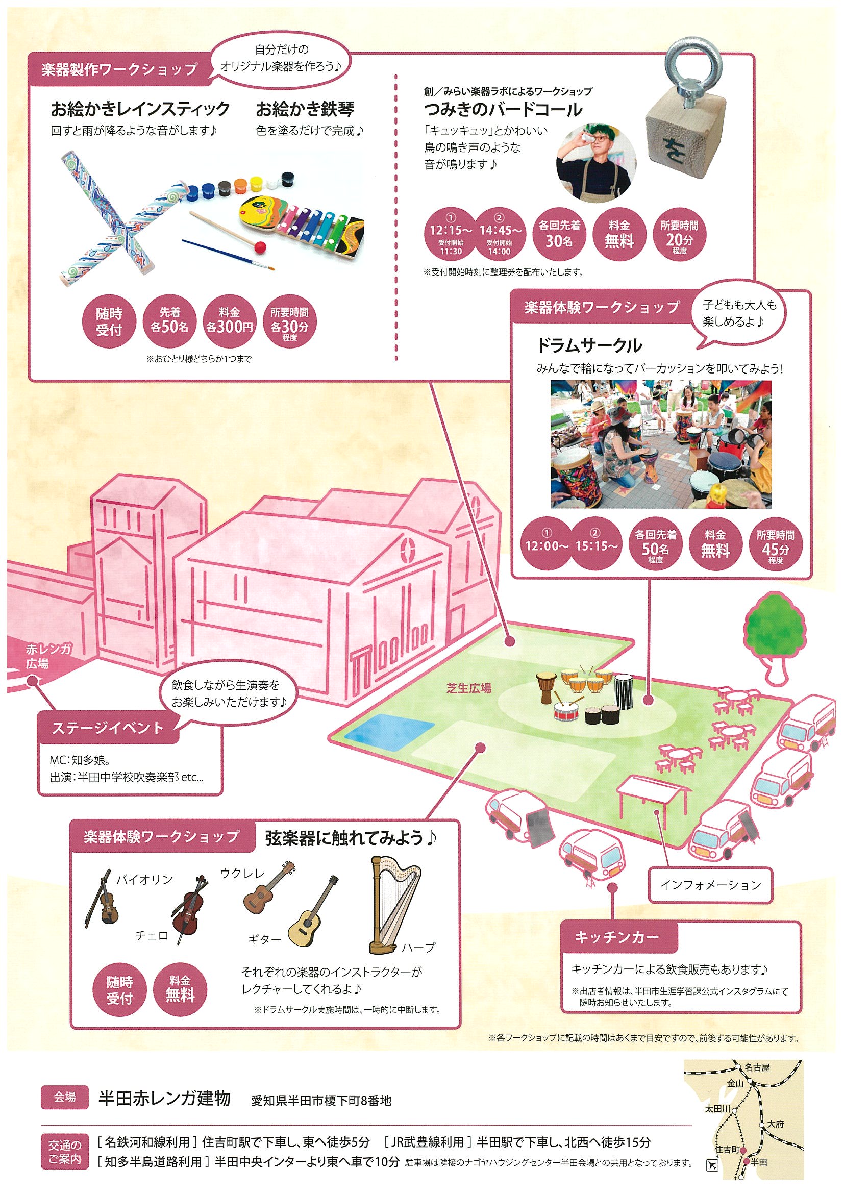 楽器体験や楽器製作のワークショップを中心とした屋外での音楽イベントです♪