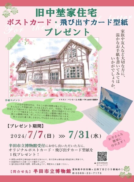 7月中(休館日を除く)、半田市立博物館にお越しいただいた希望者の方に、旧中埜家住宅のオリジナルグッズである「ポストカード」やメッセージカードとしても使える「飛び出すカードの型紙」をプレゼントします。