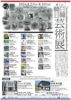 蔵のまちエリア 2024/07/10 up 第7回 日韓芸術展 日本と韓国の作家たちが作品を展示 開催日程 2024/8/28/10 開催場所 アトリエイリマル・旧中埜半六邸 今回で7回を迎える日韓芸術展は、日本と韓国の作家たちが作品を展示するとともに、会場の一部で制作活動を行いお互いの制作姿勢や作品、素材について語りあい交流します。 ◇開催日:2024年8月2日-10日 ◇時 間:10:00~17:00 ※入場は16:30まで ◇場 所:①アトリエイリマル(半田市銀座本町2-36) ②旧中埜半六邸 (半田市中村町1-7) ◇お問合せ:日韓芸術展実行委員会 090-5036-0007 (名和ショウ)