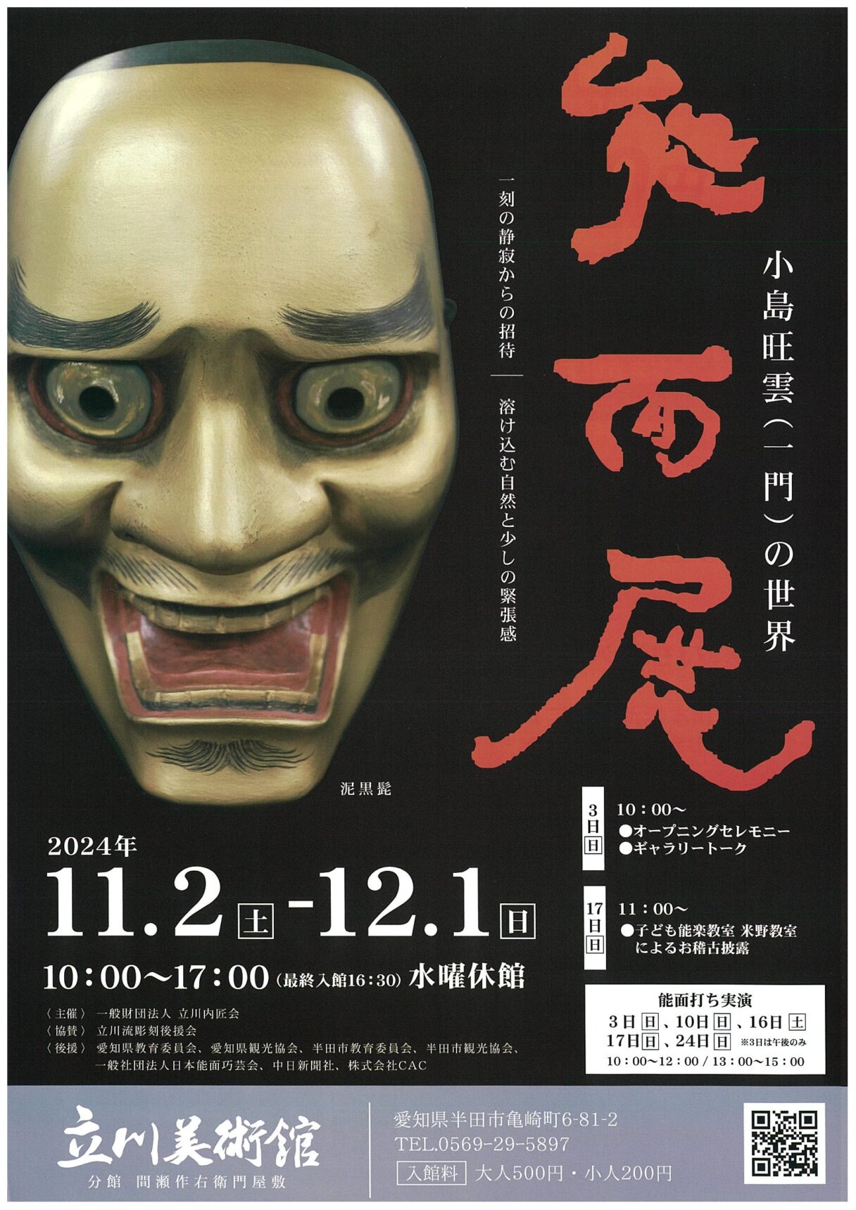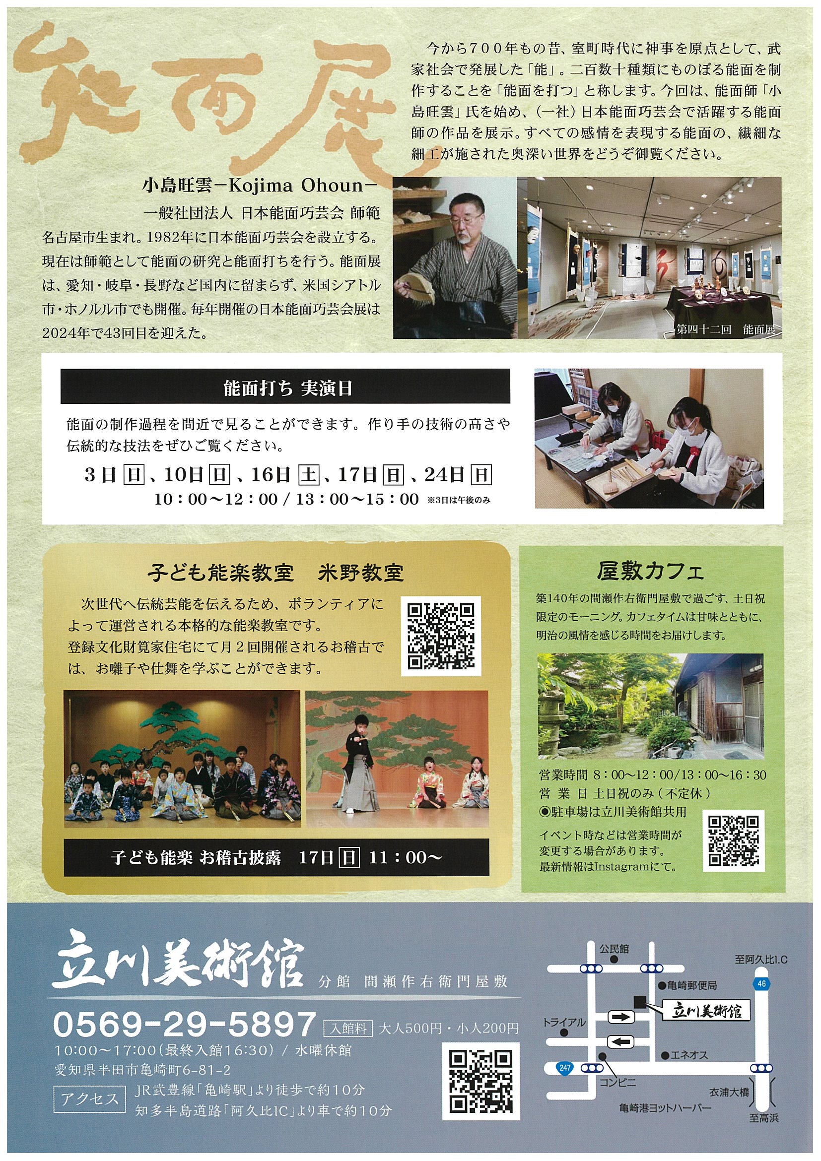 能面師の小島旺雲氏とその一門の皆様の作品を展示します。土日祝は美術館隣接の間瀬作右衛門屋敷でも展示が有ります。また、期日中には、能面打ち(制作)の実演日もあり、貴重な制作過程、伝統的な技法、作り手の卓越した技術を間近でご覧頂けます。