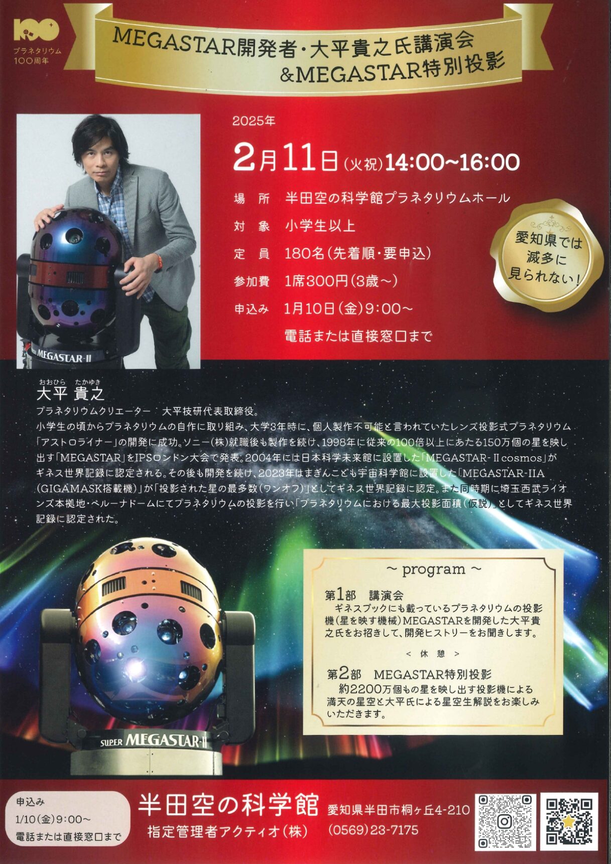 投影星数が光学式では最多で約12億個で「投影された星の最多数(ワンオフ)」として、また「プラネタリウムにおける最大投影面積(仮説)」としてもギネス世界記録に認定されたプラネタリウム投影機MEGASTAR。現在、常設施設がない愛知県内では滅多に見る事が出来ませんが、今回、プラネタリウムクリエイター・大平技研代表取締役の大平貴之氏によるMEGASTAR開発のお話とMEGASTARを使っての星空生解説をお楽しみ頂けます。