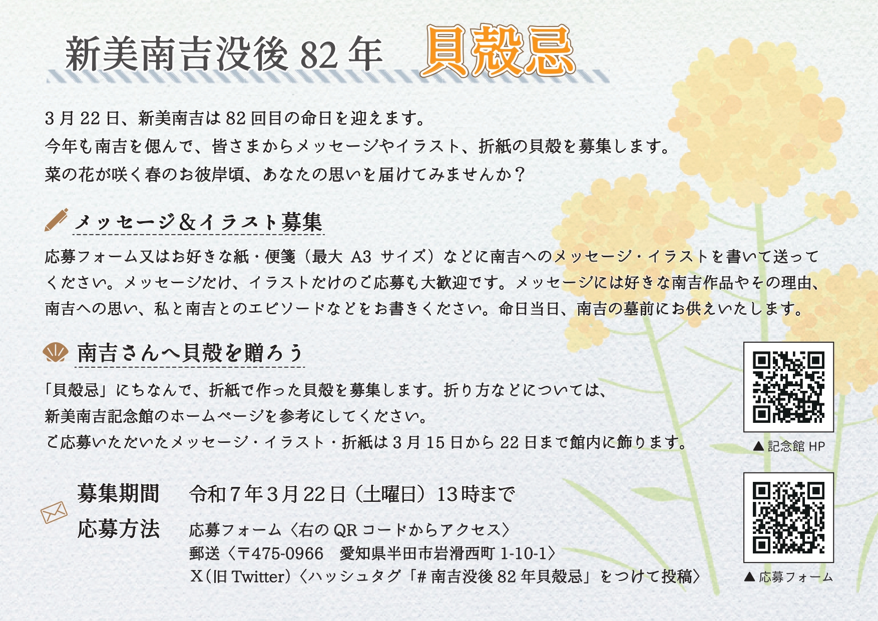 2025年3月22日、新美南吉は82回目の命日を迎えます。半田市では、南吉さんの命日を『貝殻忌』と呼び、毎年様々なイベントを開催しています。また、南吉さんを偲ぶメッセージやイラストを募集しますので、それぞれの形で南吉さんへの想いを届けて下さい。