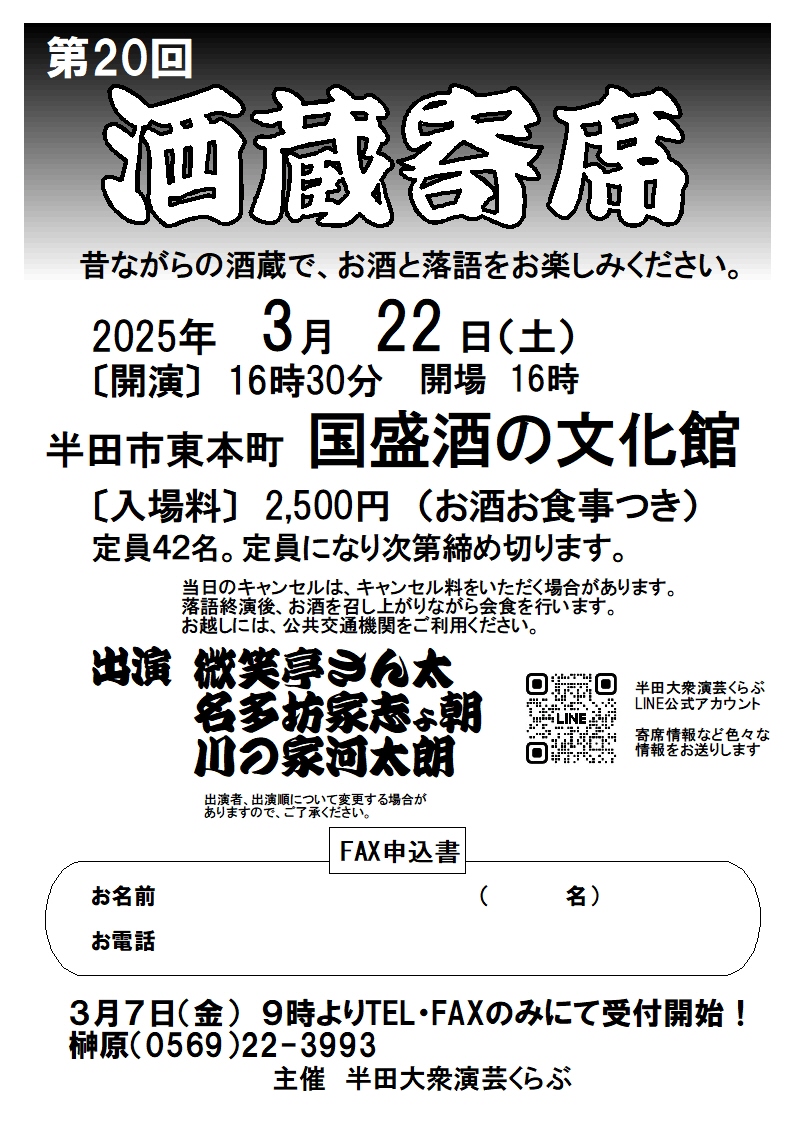 築200有余年の古い酒蔵をそのまま利用したお酒の資料館で落語をお楽しみ頂いた後は、おいしいお酒とお食事をご堪能下さい。