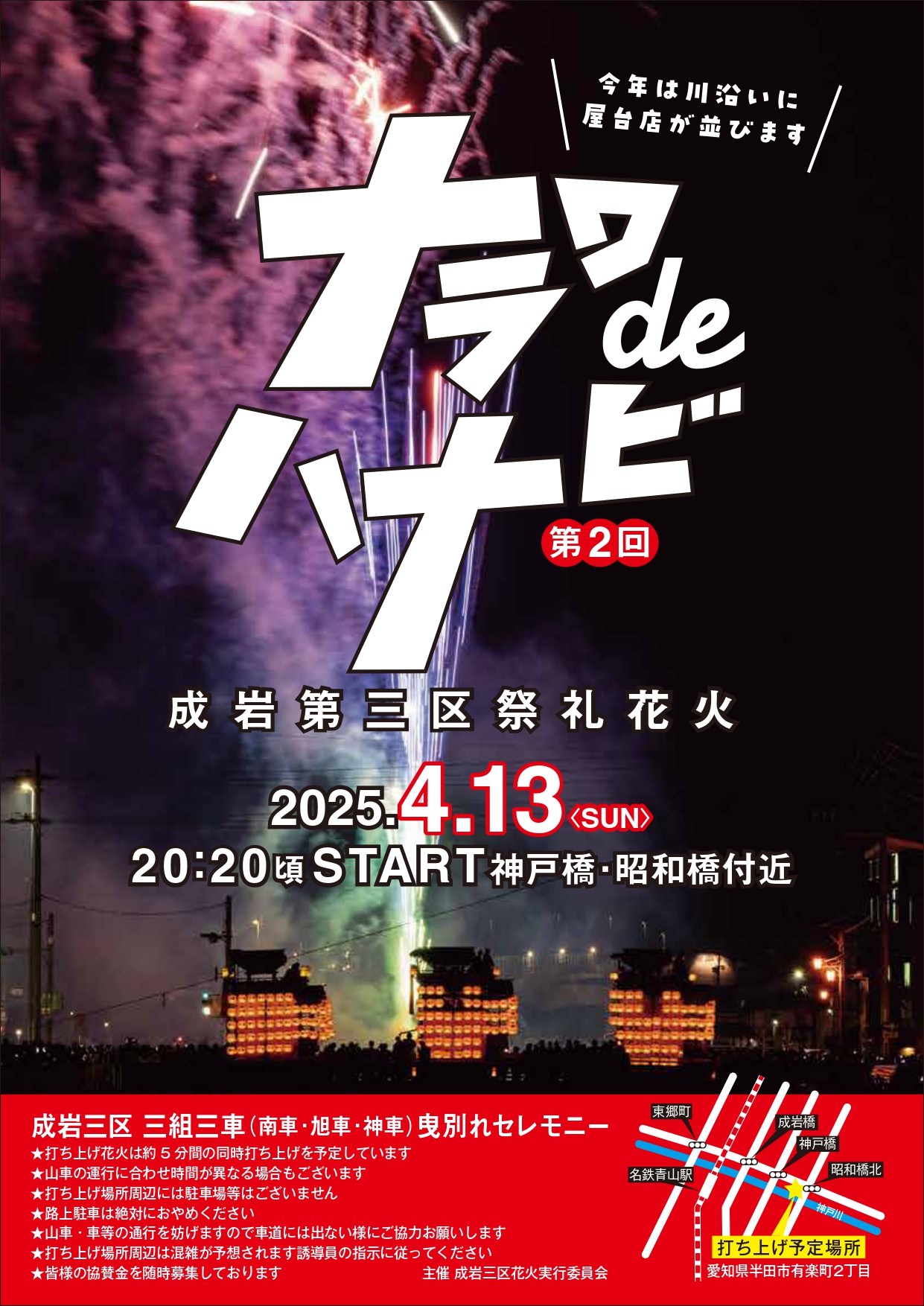 「半田の春まつり」成岩第三区祭礼で、南車・旭車・神車の曳別れセレモニーとして、約5分間の同時打ち上げ花火が開催されます。