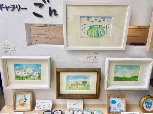 ツメサキの世界さん直筆の新美南吉のお話や詩の一節とともにイラストを展示。