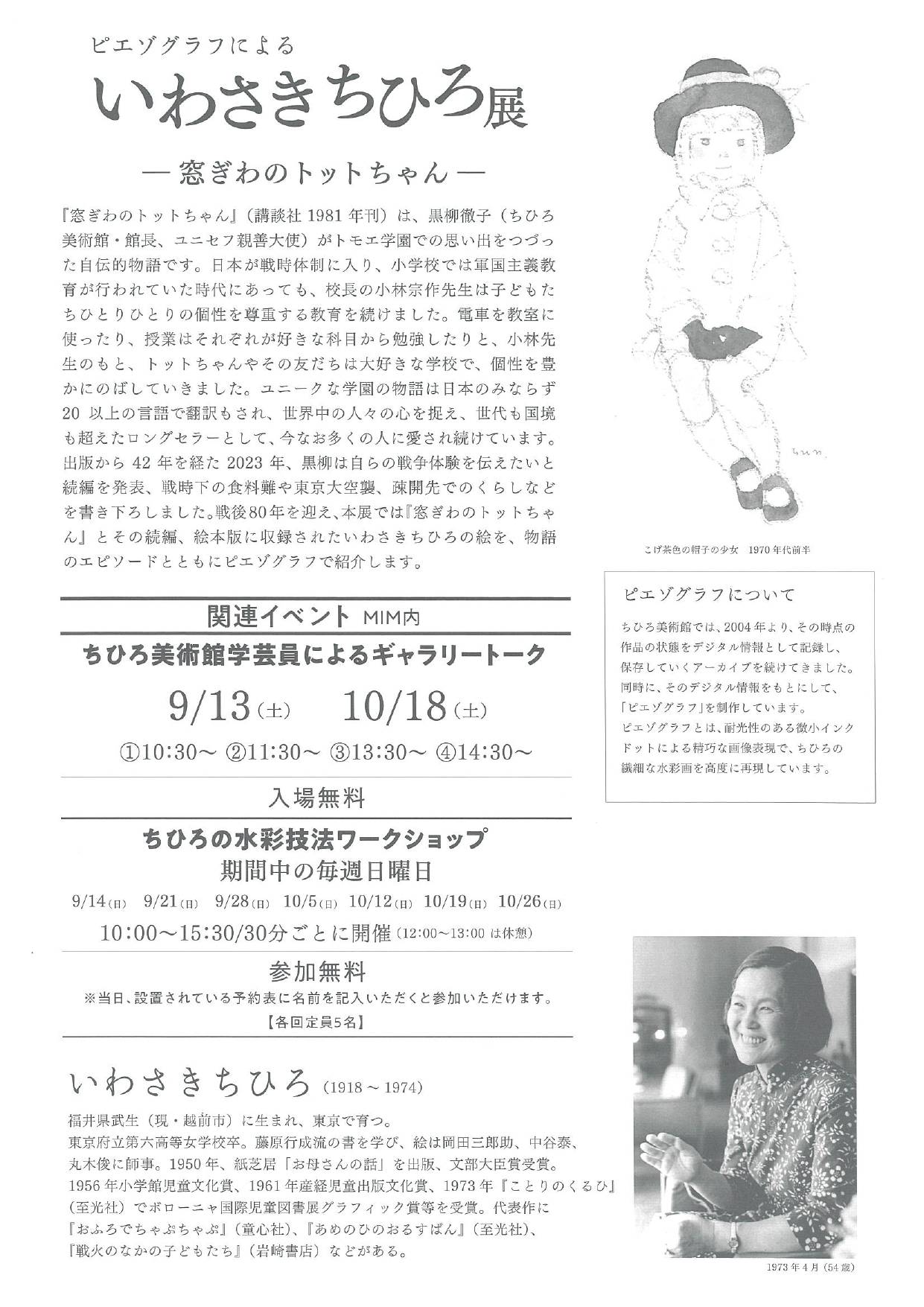 本展では『窓ぎわのトットちゃん』とその続編、絵本版に収録されたいわさきちひろの絵を、物語のエピソードとともにピエゾグラフで紹介します。