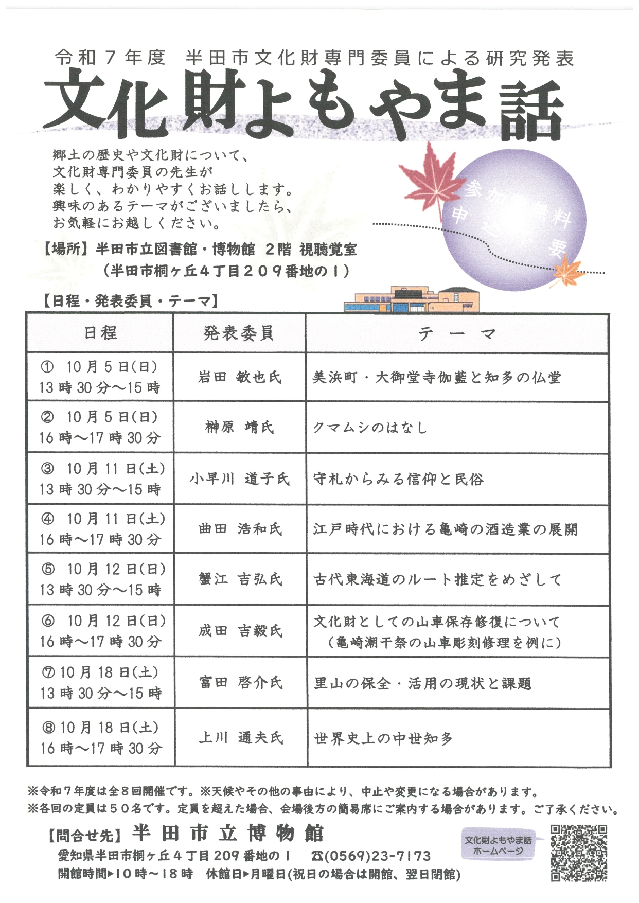 半田市文化財専門委員の先生が、郷土の歴史や文化財について様々なテーマでわかりやすくお話しします。