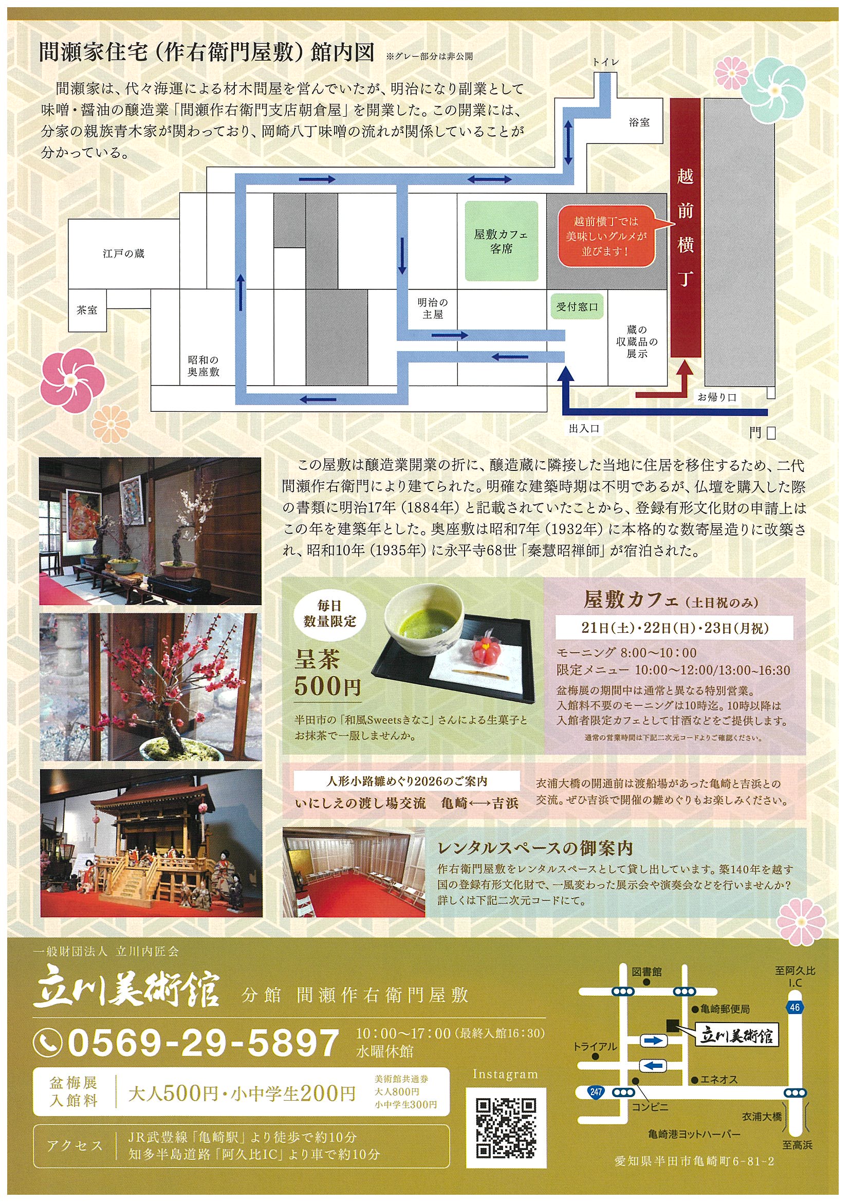代々海運による材木屋を営み、明治になり副業として味噌醤油の醸造業を開業した間瀬家二代間瀬作右衛門の代に建てられた屋敷が、立川美術館分館 作右衛門屋敷として公開されています。令和5年11月には、国の登録有形文化財に認定されました。