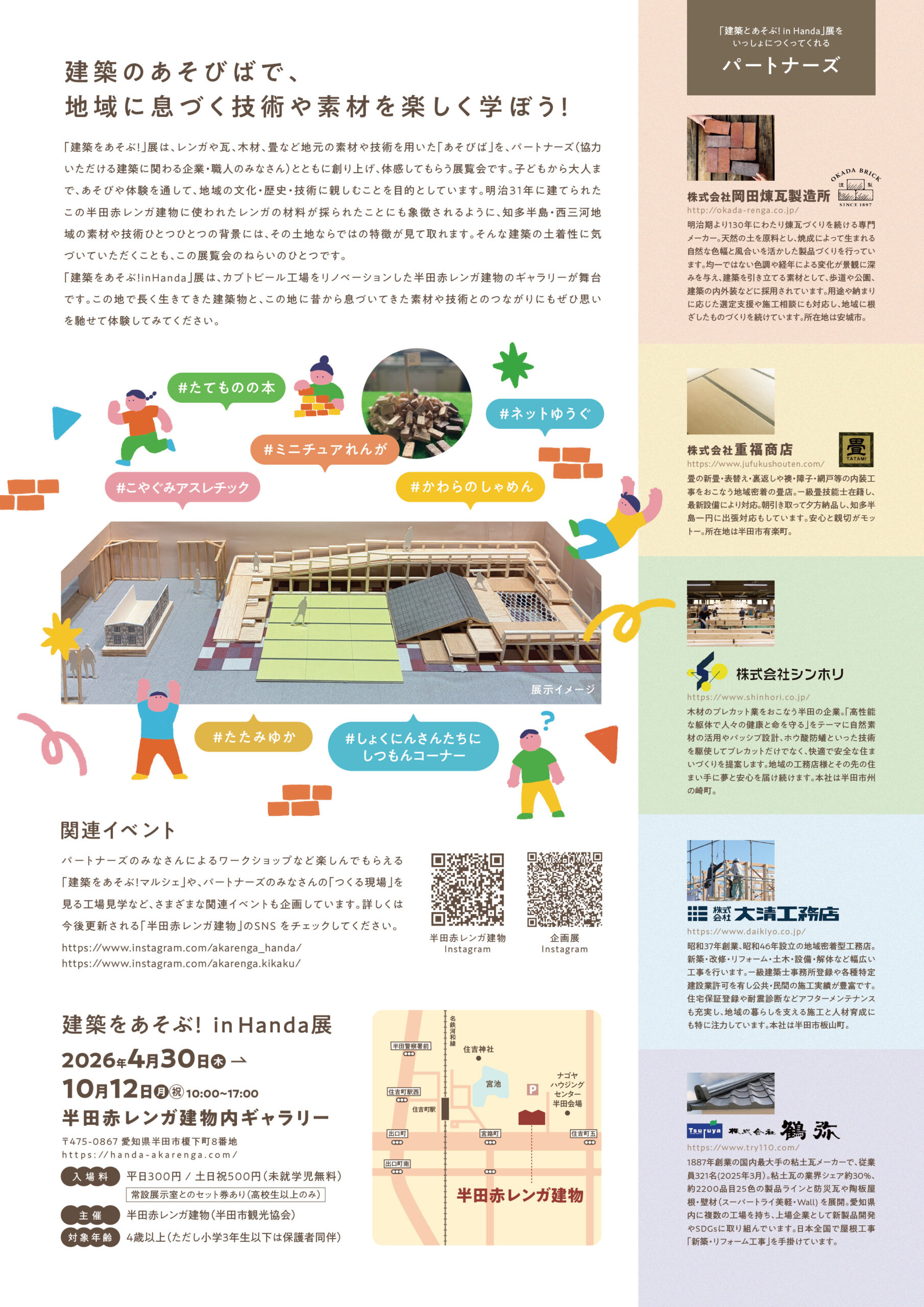 「建築をあそぶ!」展は、レンガや瓦、木材、畳など地元の素材や技術を用いた「あそびば」を、パートナーズ(協力いただける建築に関わる企業・職人のみなさん)とともに創り上げ、体感してもらう展覧会です。