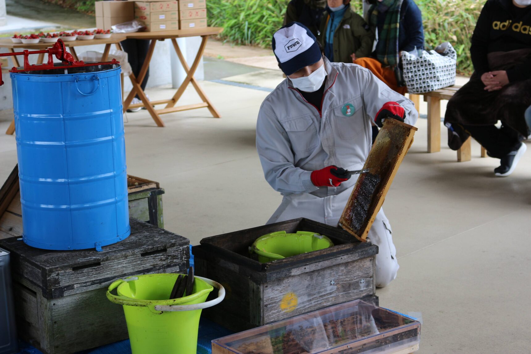 そんなミツバチを取り巻く現状を子どもたちに伝え、ミツバチと自然環境の大切さを感じてもらえるよう、新美南吉記念館横の童話の森で年に一回「童話の森で採蜜体験」を開催しています。多くの親子が実際にミツバチの巣からはちみつが取れる様子を体験したり、実際にとれたてのはちみつを味わったり。