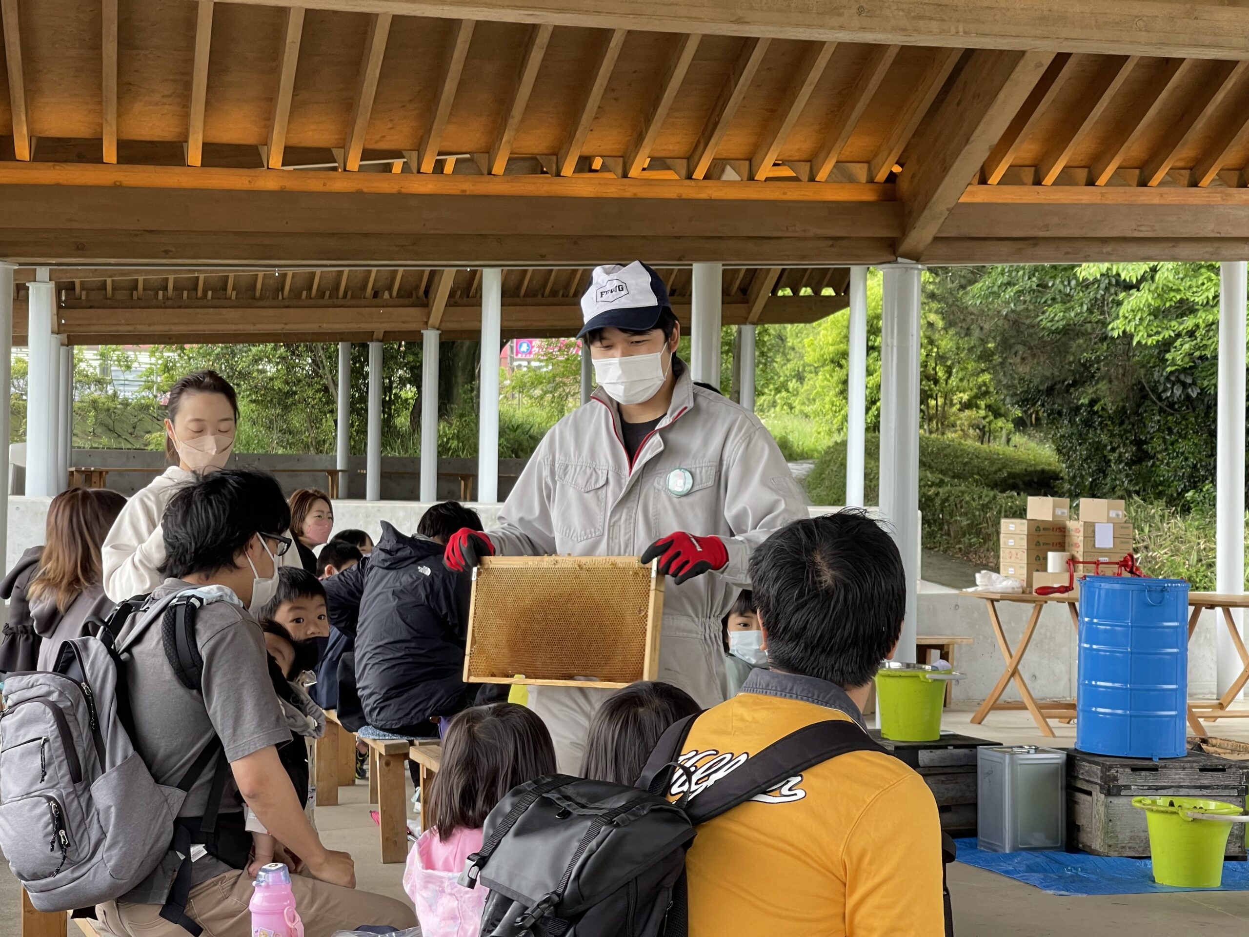 そんなミツバチを取り巻く現状を子どもたちに伝え、ミツバチと自然環境の大切さを感じてもらえるよう、新美南吉記念館横の童話の森で年に一回「童話の森で採蜜体験」を開催しています。多くの親子が実際にミツバチの巣からはちみつが取れる様子を体験したり、実際にとれたてのはちみつを味わったり。