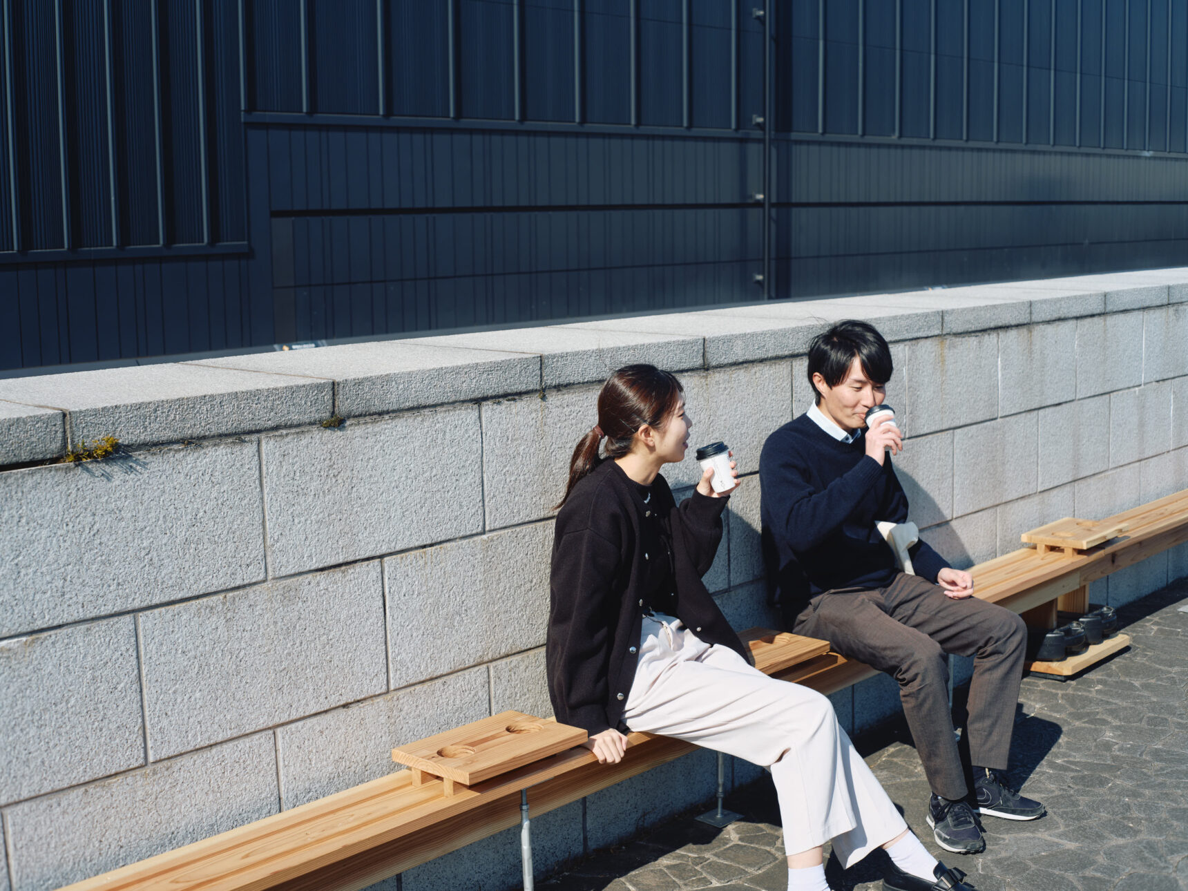半田運河沿いの遊歩道には、現在エリア価値の向上に向けた実証実験として「運河床」が設置されています。半田運河を眺めながら、ゆっくりとした時間を過ごすことのできる居場所です。お天気のいい日には、旅の途中で一休憩。飲み物片手にのんびりすごしてみては?