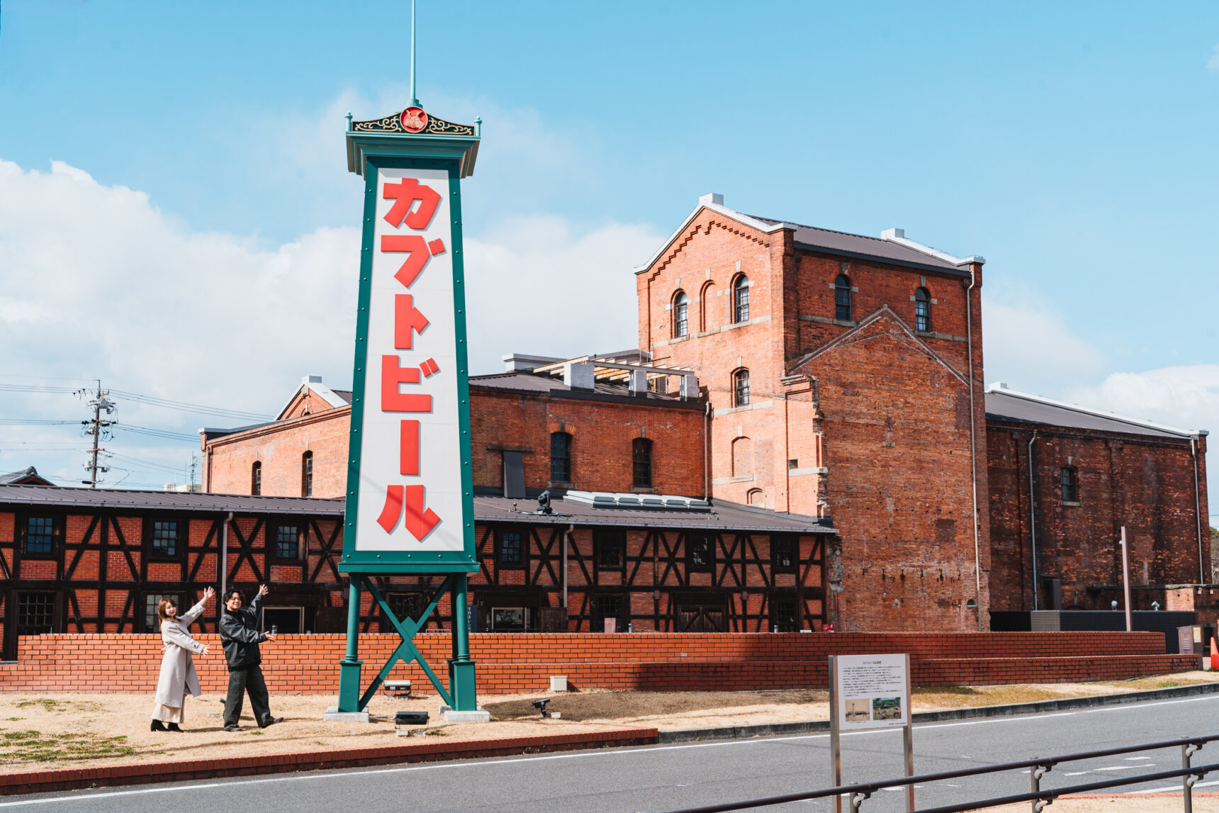 明治時代にカブトビール工場として建てられた建物で、この時代に建てられたレンガ建造物としては⽇本で五本の指に⼊る大きさ。カブトビールの広告塔の前の人気のフォトスポットで思い出の写真をぜひ。