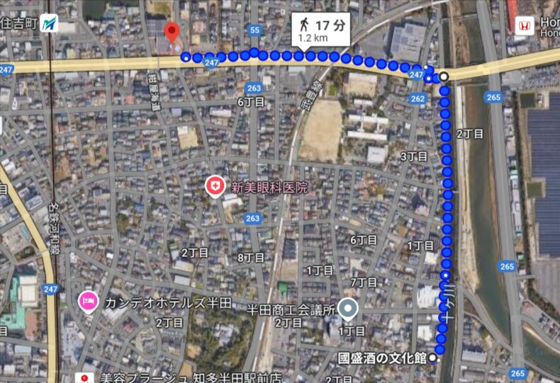 - 名鉄知多半田駅(スタート)→ MIM → 魚太郎 → 國盛酒の文化館 → 半田赤レンガ建物・Café&Beerhall Re-BRICK → 名鉄住吉町駅 (ゴール)