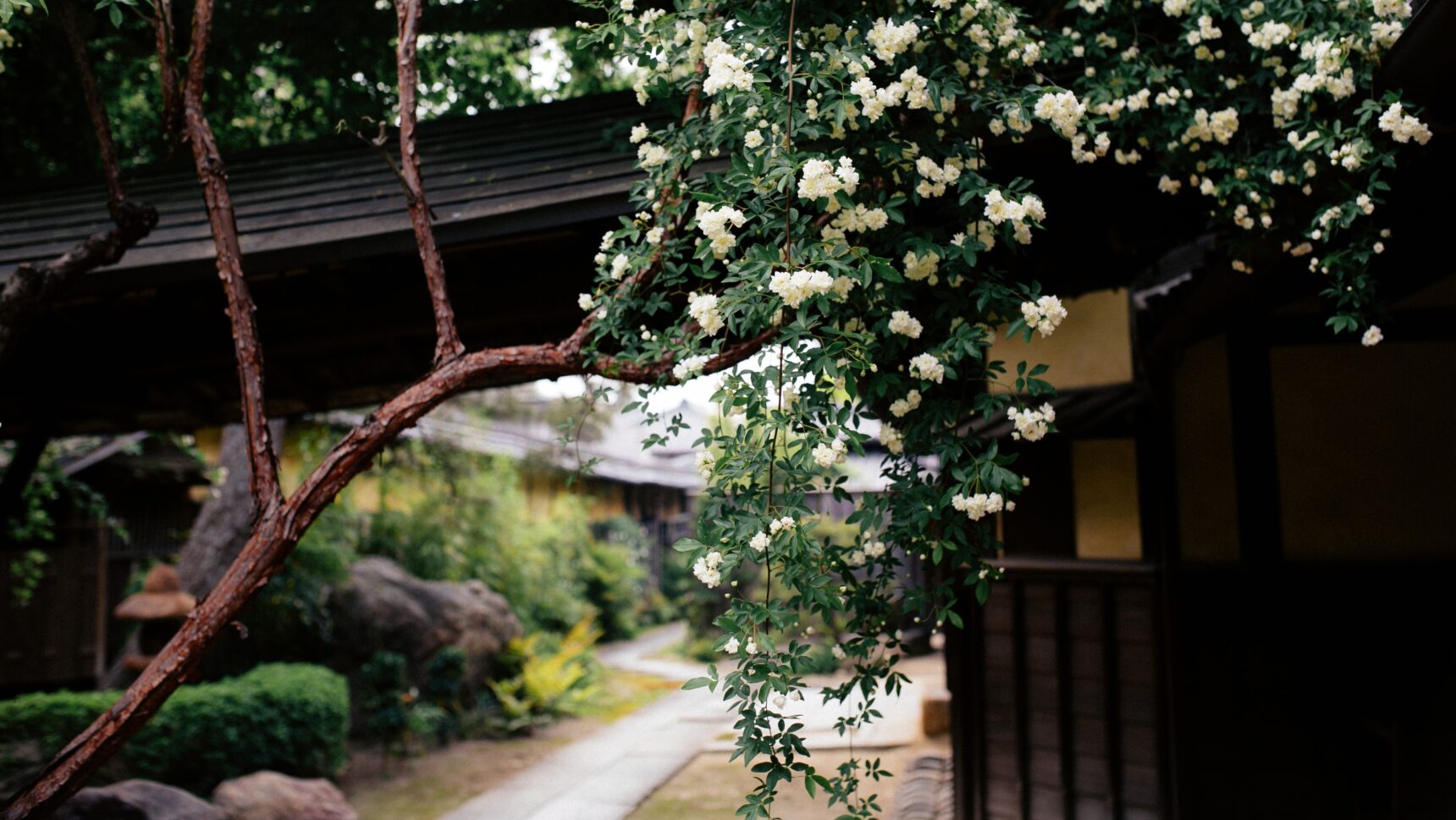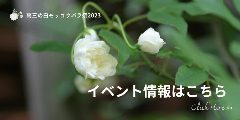 小栗家住宅の庭には、「萬三の白モッコウバラ」と呼ばれる樹齢150年を超える日本最古・最大級の白モッコウバラが植えられてます。「萬三の白モッコウバラ」は2011年に、半田市の天然記念物に指定され、可憐な白い花を咲かせる4月中旬から5月初旬には一般公開が行われ、香り高く美しい花姿は訪れる大勢の人々を楽しませてくれます。