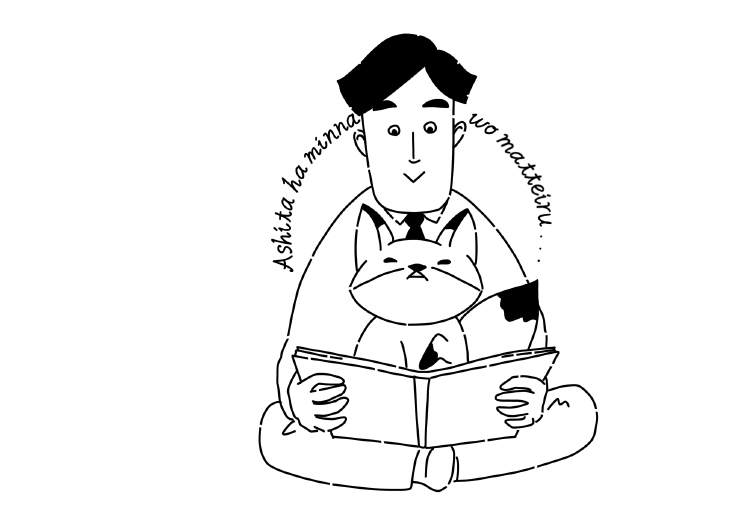 作者コメント:新美南吉が⼦狐を膝に乗せて絵本を読んでいるところです。狐は新美南吉作品に登場する代表的な動物であり、⼦狐を⼦供、南吉を⽗親とみたて、⽗⼦の絵本を読むやさしい時間を表現しました。未婚で夭逝した南吉を想い、デザインしました。デザイン⾯では布製に単⾊プリントすることも考え、なるべくシンプルに⽼若男⼥誰にでも親しまれるようなかわいらしさが出るようにしました。