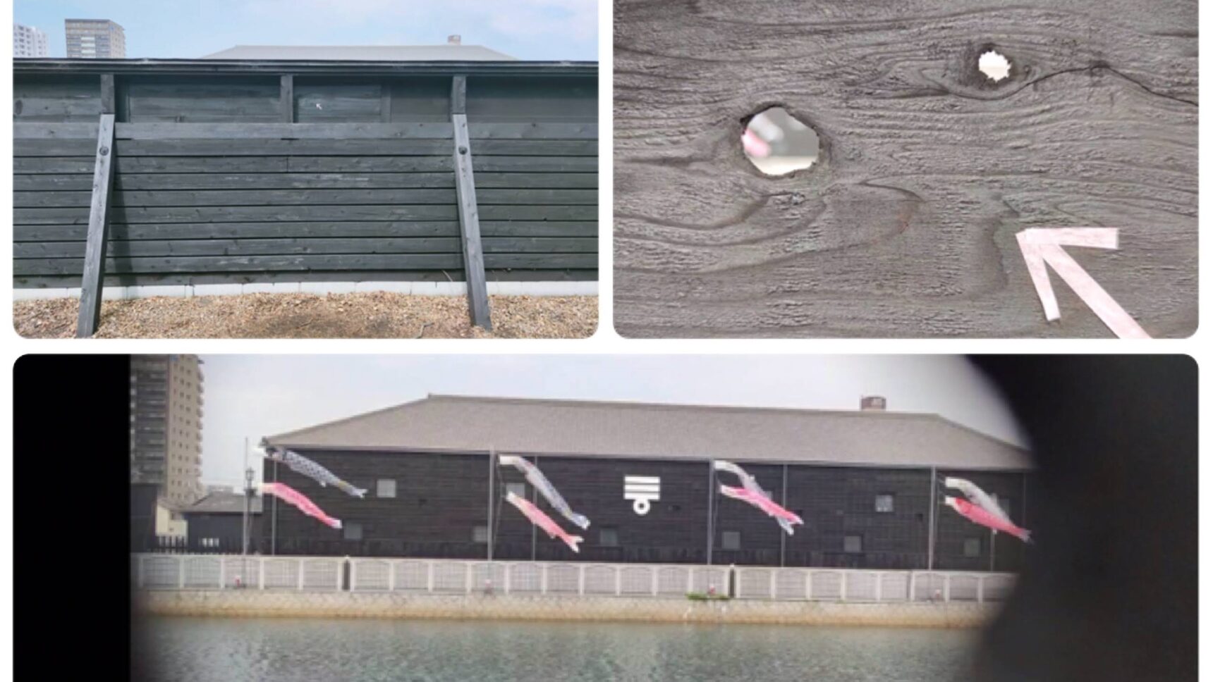 半田運河の西側の道沿いにある黒壁の一角にあいた小さな穴。そこから対岸が見えますよ。特に鯉のぼりの季節にはかわいい一枚が取れますよ!