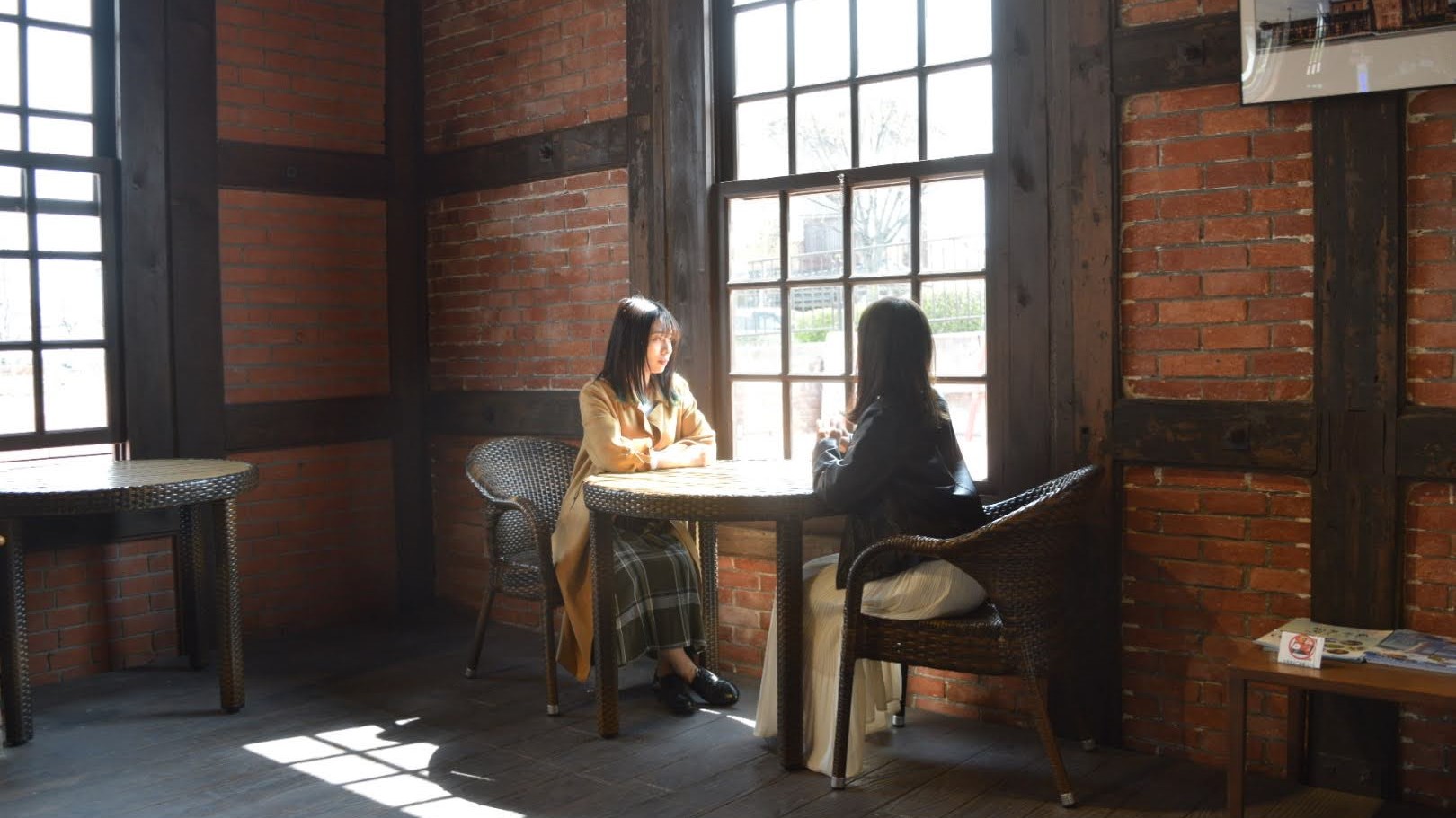 施設内のカフェは窓辺の席で。ガラス越しに窓から入る光がドラマチックな雰囲気をつくりだしてくれます。