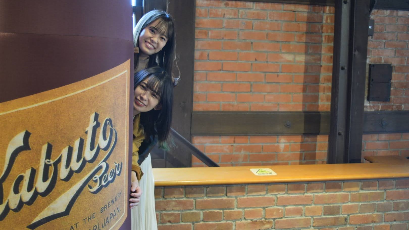 カフェの中に飾られたカブトビールのオブジェの陰からみんなでひょっこりしてみよう!