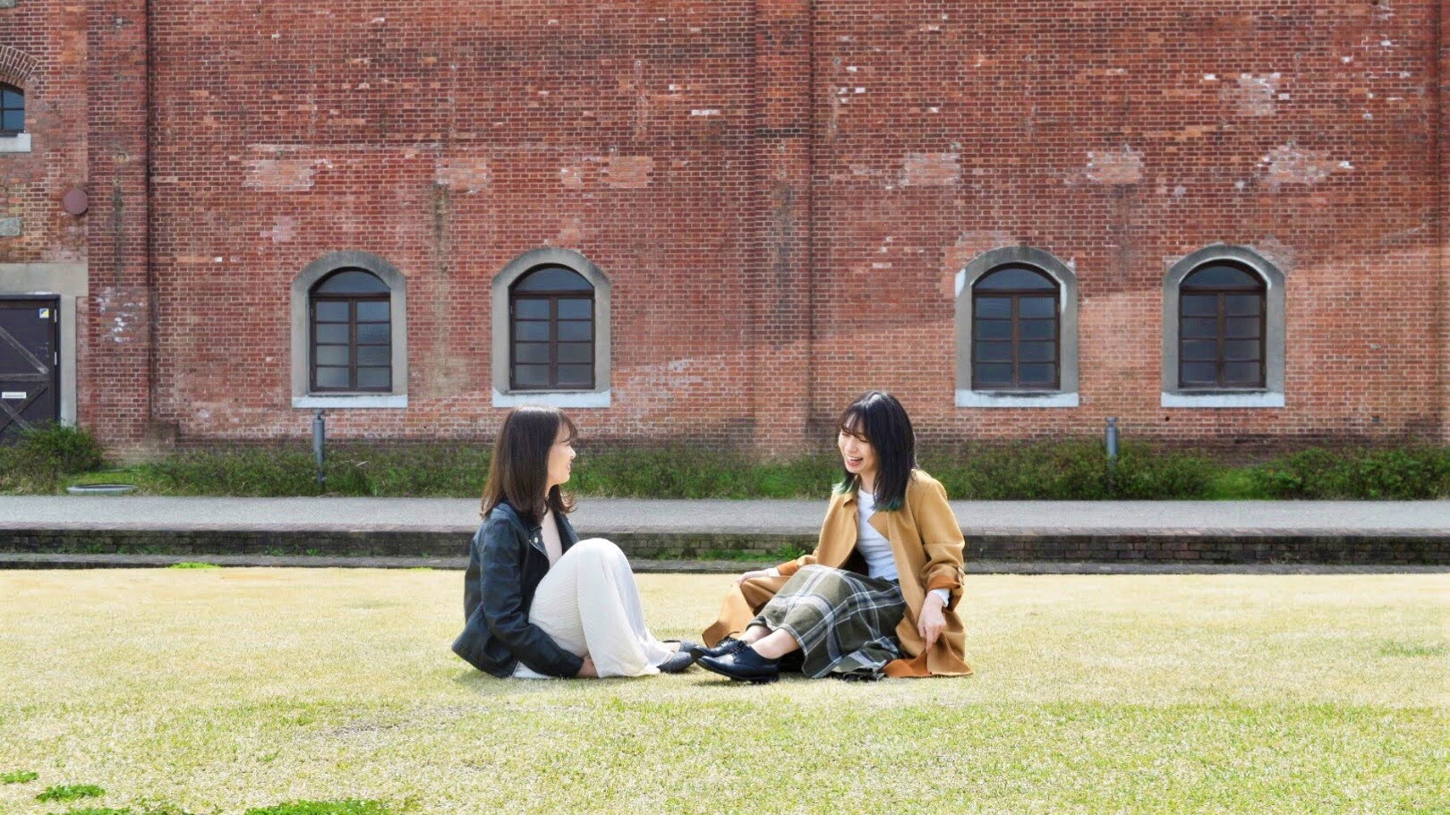建物の裏手に広がる広い芝生広場ではゆったりとした空間で撮影を楽しむことができます。建物を背景に撮影すると迫力のある写真も撮れますよ!