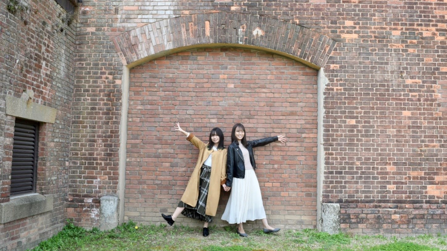 レトロな雰囲気のレンガの壁を背景に撮ってみて!動きのあるポーズをつくるのがおすすめ