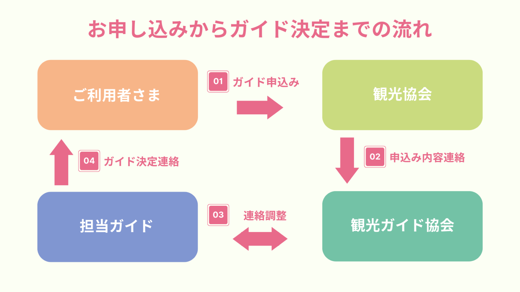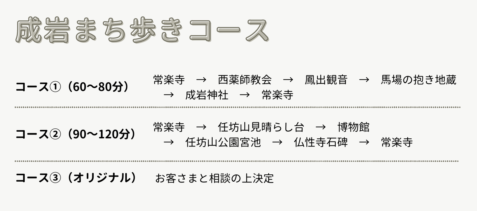 - 観光ガイドとの待合わせ場所やガイドコースなどの細部については、ご利用日の前日までに担当する観光ガイドとお打合せください。