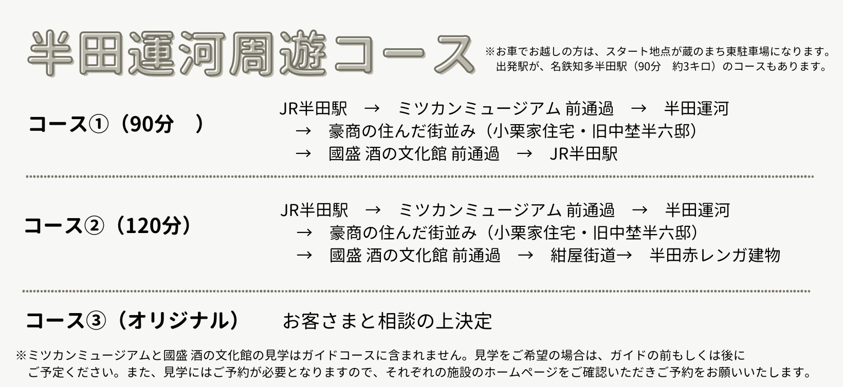 ※①と②のコース内で、ミツカンミュージアム、國盛 酒の文化館の見学は含まれません
