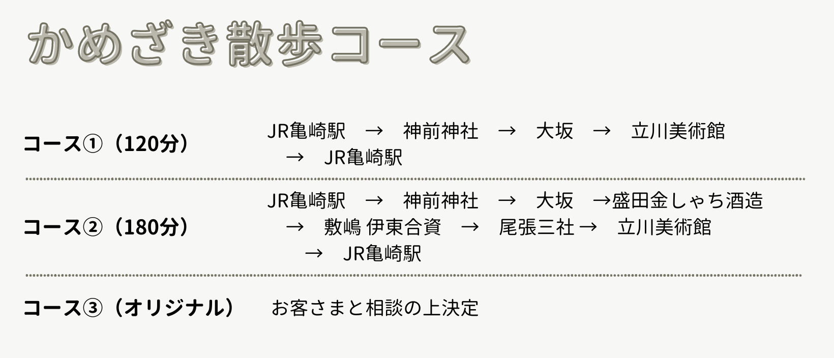 4つのモデルコースをご用意しております。ご希望のコースを基本にして、観光ガイドと利用者さまで相談してオーダーメイドの内容にすることも可能です。