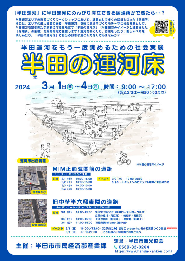 2024年3月1日(金)〜4日(月) の4日間、半田運河沿いの2か所の場所に、滞在できる居場所として「半田の運河床」を設置し、「半田運河」に居場所ができると人は滞留するのか、人が滞留すると新たな文化、新たな消費が生まれるのかを検証する目的で、社会実験を行います。「半田の運河床」の実施期間中は、既存店舗(リトリートキッチン)や出店(キッチンカー等)連動し、滞在する楽しみや来訪の目的の創出を図っていきます。