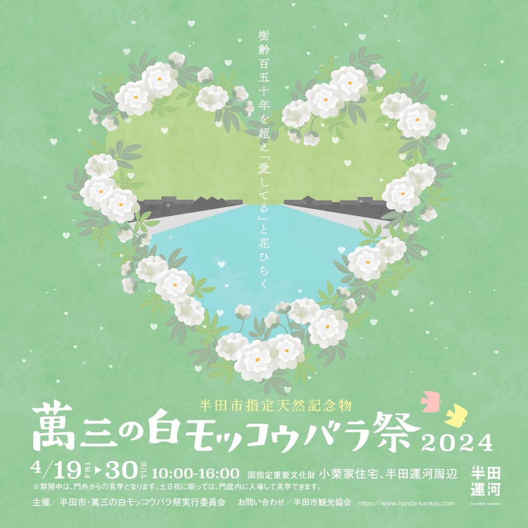 毎年、国指定重要文化財 小栗家住宅の庭にある、半田市指定天然記念物「白モッコウバラ」を、開花の時期に合わせ特別公開しています。期間中は、萬三の白モッコウバラの花酵母を使用したお酒”愛してる”を限定販売するほか、毎週末には、ワークショップ、マルシェ出店、日本酒や和菓子を楽しめる企画など、様々なイベントを開催しました。